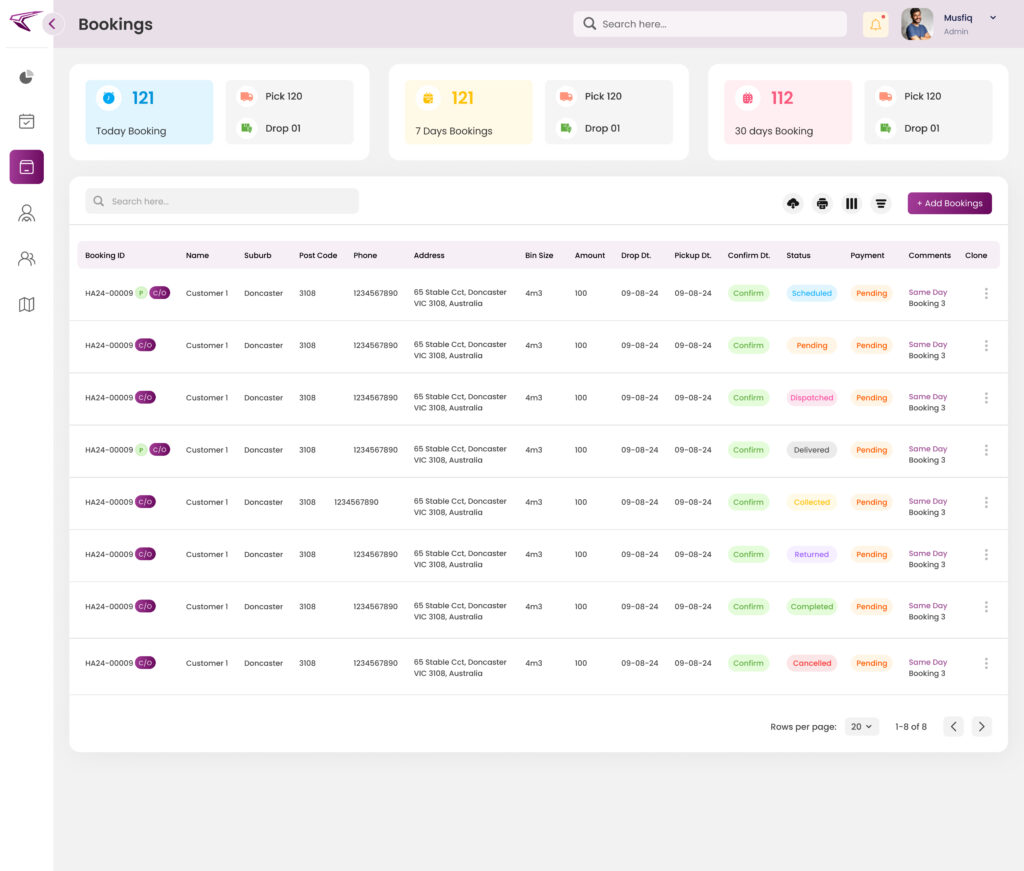 Efficiently manage your skip bin bookings with Cloudbin’s comprehensive booking system. View, track, and update booking details in real-time, including customer information, bin sizes, and delivery statuses.Â